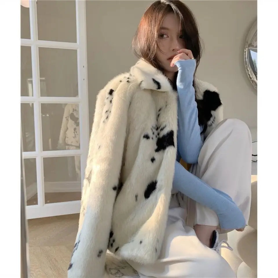 A statement in texture and contrast, The Mirage Jacket embodies modern Western luxury. Crafted from plush imitation mink fur with a striking black and white cow pattern, it delivers warmth, texture, and undeniable presence. The square neckline and pullover silhouette bring refined structure to its soft finish, while polished buttons add a hint of metallic elegance.